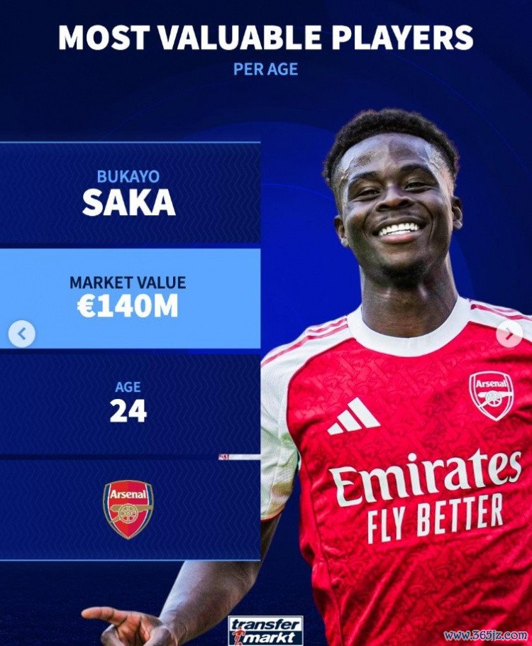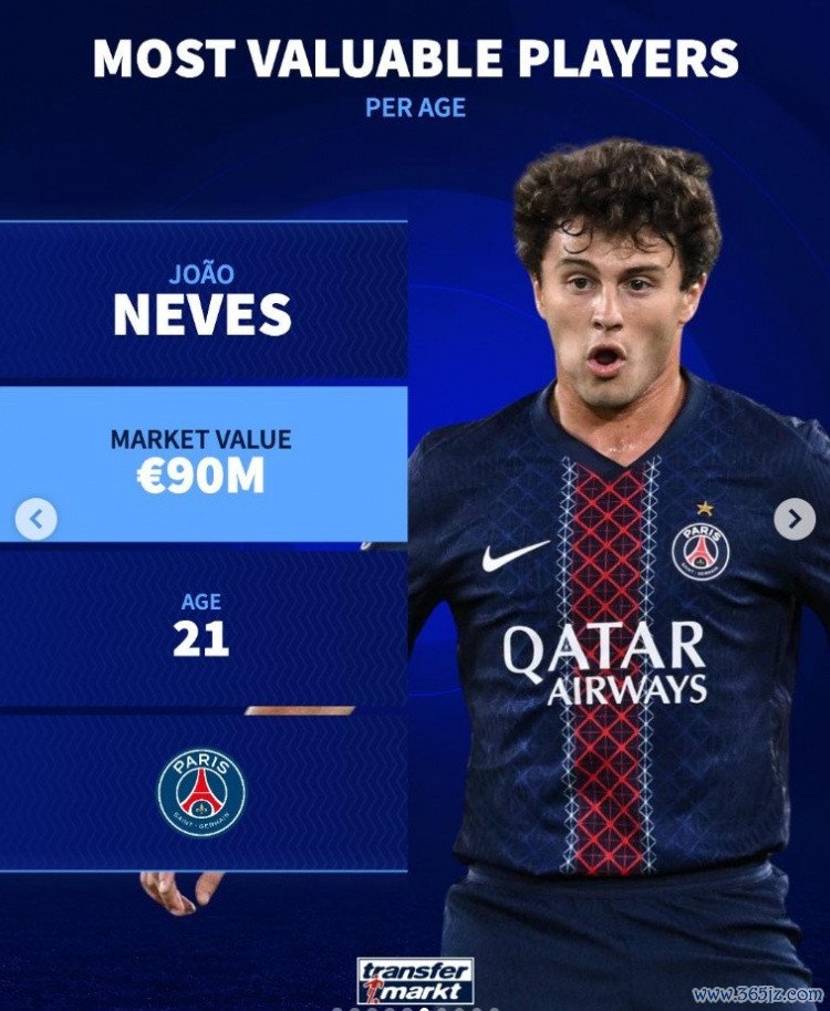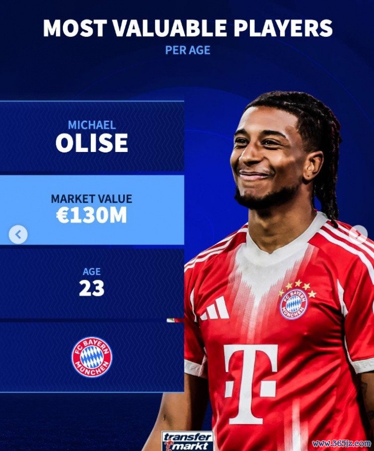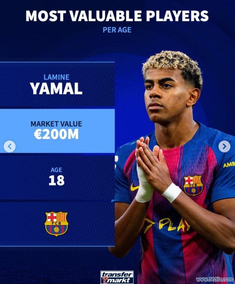 直播吧11月9日讯《转会阛阓》统计了16岁到25岁的各年级最高身价情况,18岁亚马尔2亿欧居首。