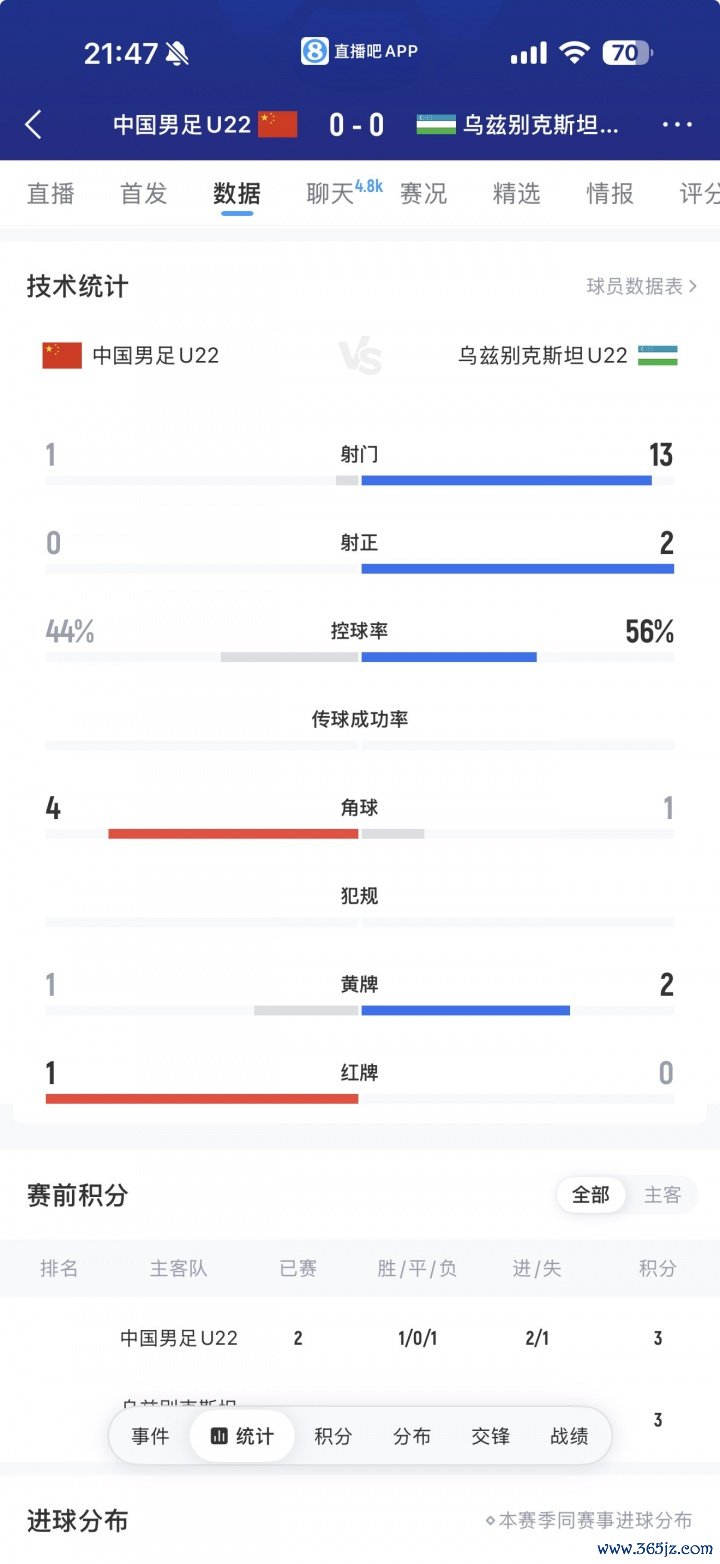 全场仅1脚射门!全场数据:U22国足射门1-13过时乌兹别克斯坦